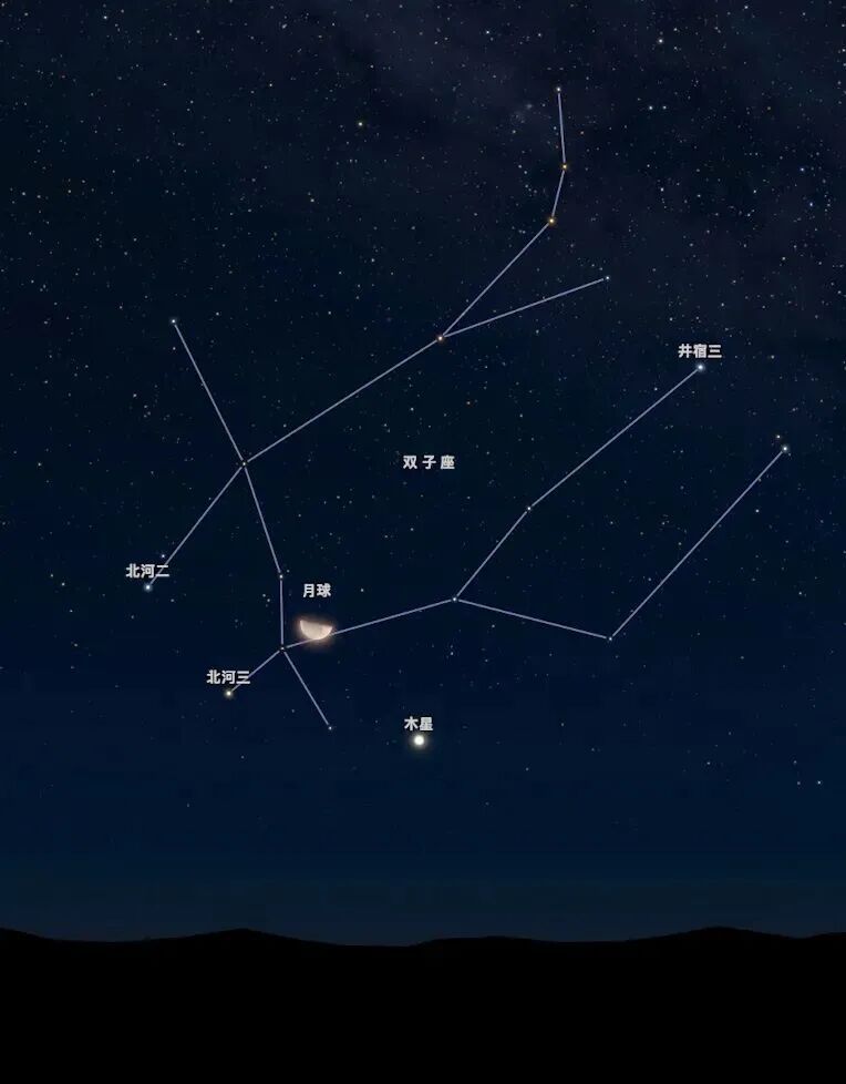 10月14日,月相下弦,月亮于10月13日午夜前从东北方升起,木星随后而行,在双子座中相遇。月亮升起后继续接近木星,天亮前达到最近。