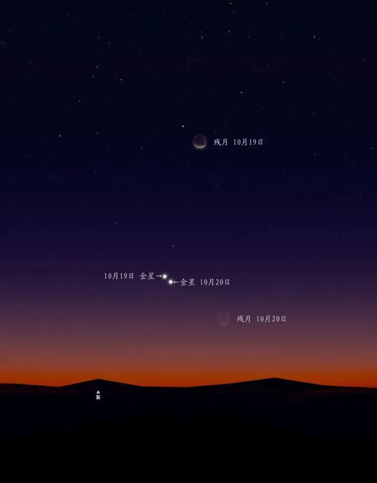 10月20日,月亮来到了黎明前的东方低空,月相也成为一弯细细的残月,与金星相遇,形成每月必看的金星伴月。